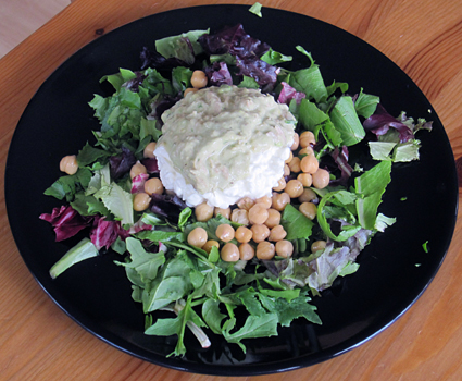 Mix tuna with green onions, avocado, lemon juice, salt, pepper and mayonnaise and spread on bread for a sandwich, or over a salad, like the picture above.